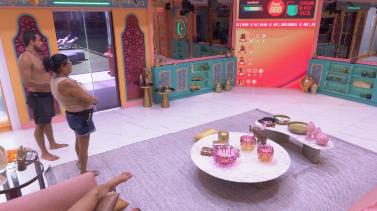 Após lavar louça e dar uma geral na cozinha, Delma se depara, na sala, com Maike olhando o telão com os emojis do Queridômetro desta terça-feira (18), passando. A dona de casa também se surpreende com a quantidade de reações negativas liberadas na dinâmica, e solta o comentário.